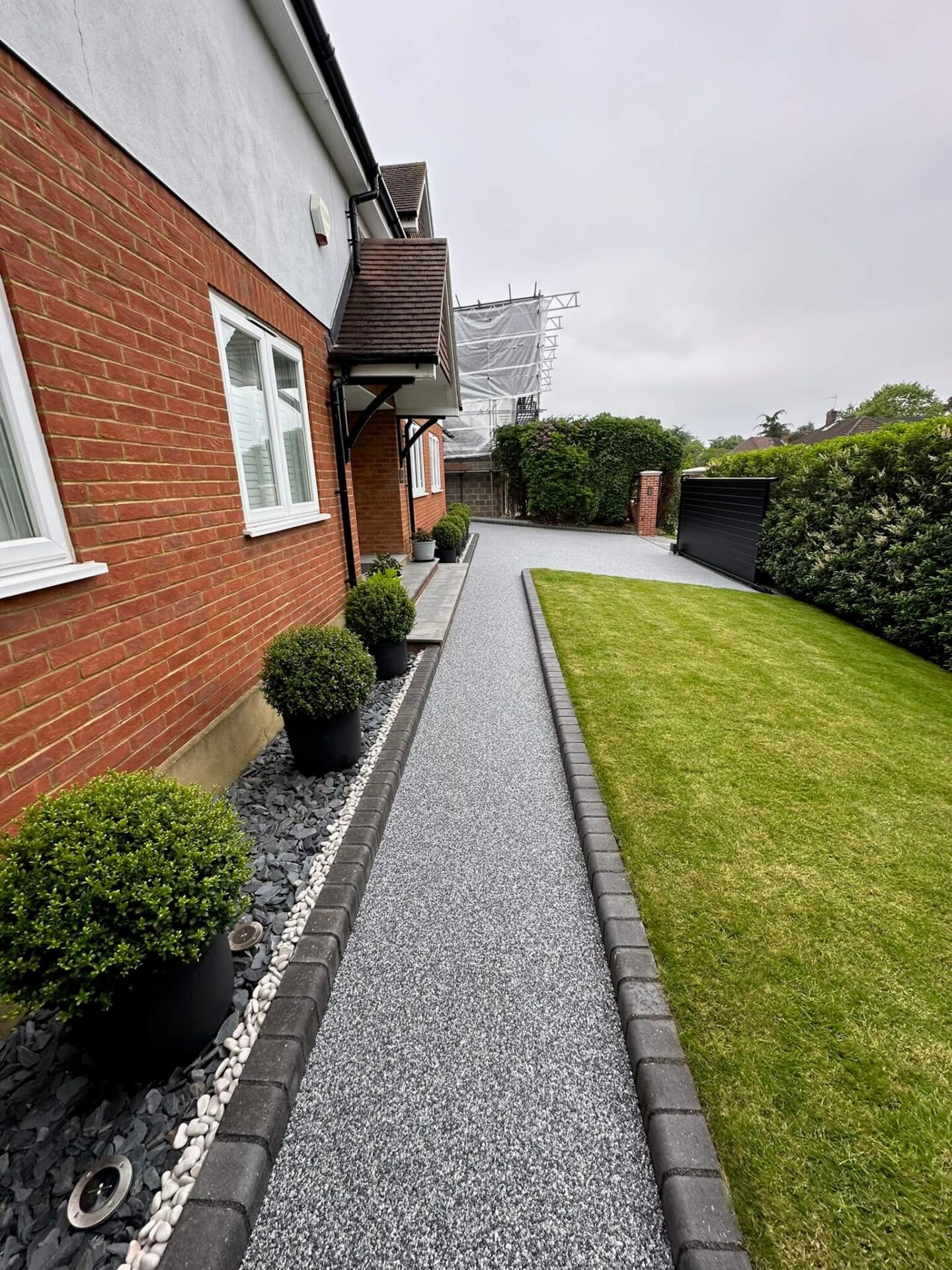 New Resin Bound driveway completed in Virginia Water, retained with low charcoal key kerbs and new turf.